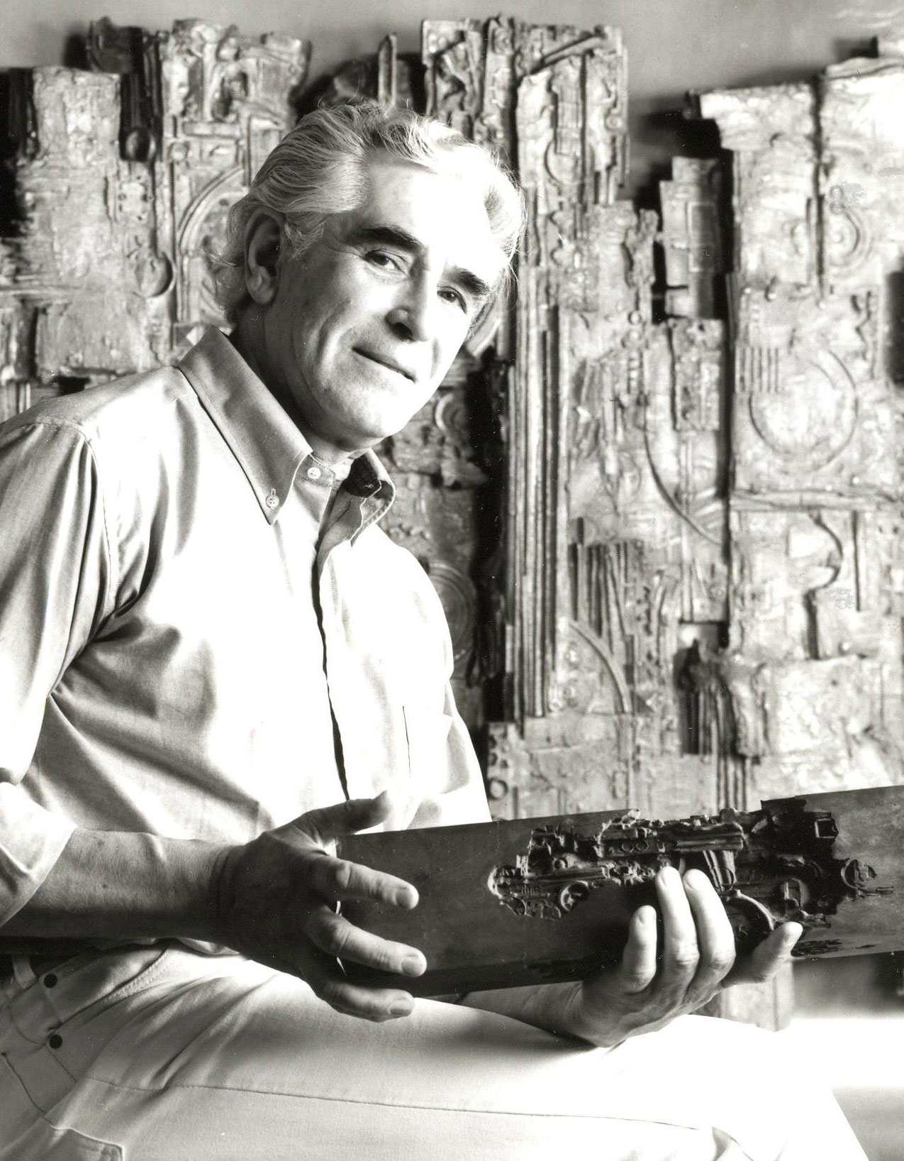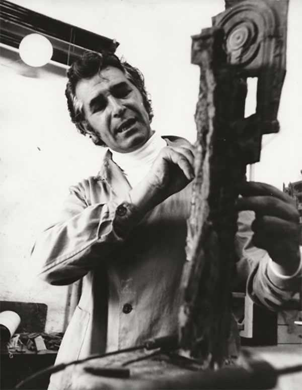 Il suo linguaggio si nutre di frammenti storici ed emblemi contemporanei, che danno vita ad una partitura unica, posta in costante tensione con le superfici dorate del bronzo e i riverberi specchianti dell’acciaio inox; nella sua immagine riflessa, il bronzo si prolunga e si perpetua in una nuova dimensione, dove spazio reale e spazio astratto si fondono e dove la condizione temporale si dà all’infinito, in una estensione metastorica (l’artista affida ad una sua opera, già nel 1988 e con grande precognizione, il titolo di Metastoria).